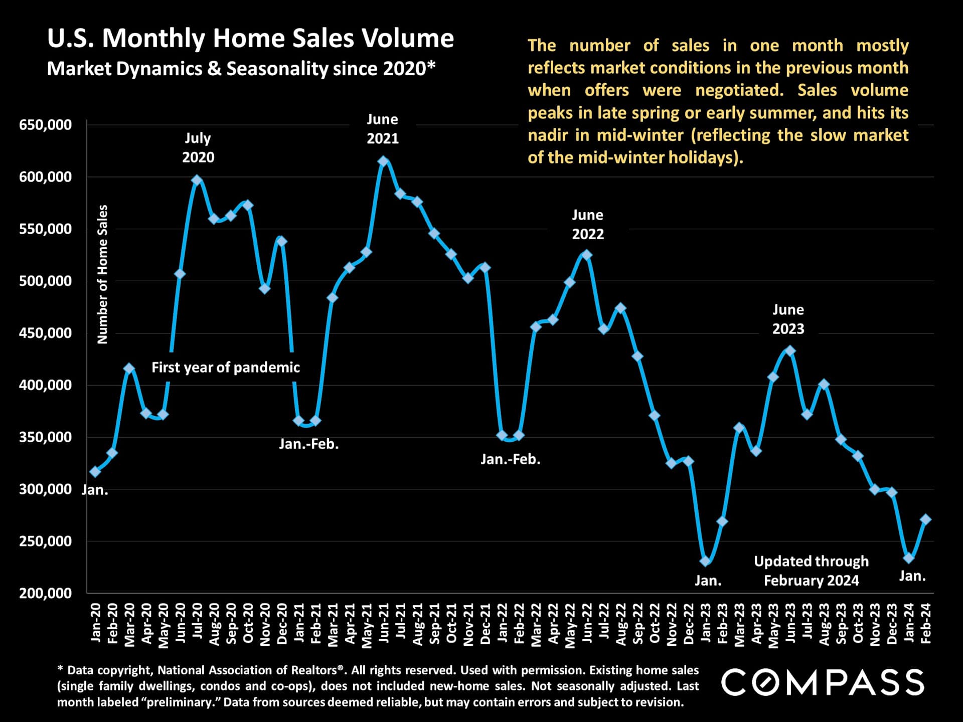 The number of sales is rebounding from its usual mid-winter low, and will continue to increase through spring, but interest rates and the extremely low inventory of listings for sale have caused a large decline in sales volumes.
