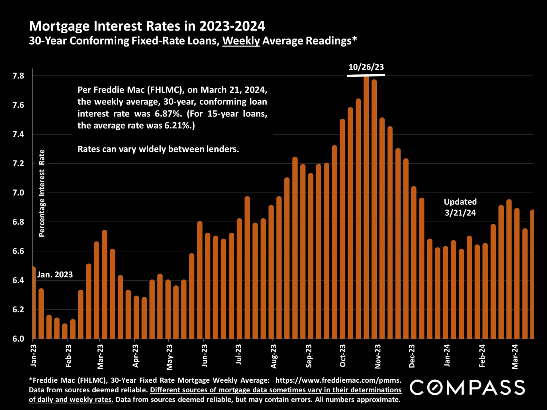 After the large decline from late October, mortgage interest rates have been fluctuating within a relatively narrow range of values in 2024.