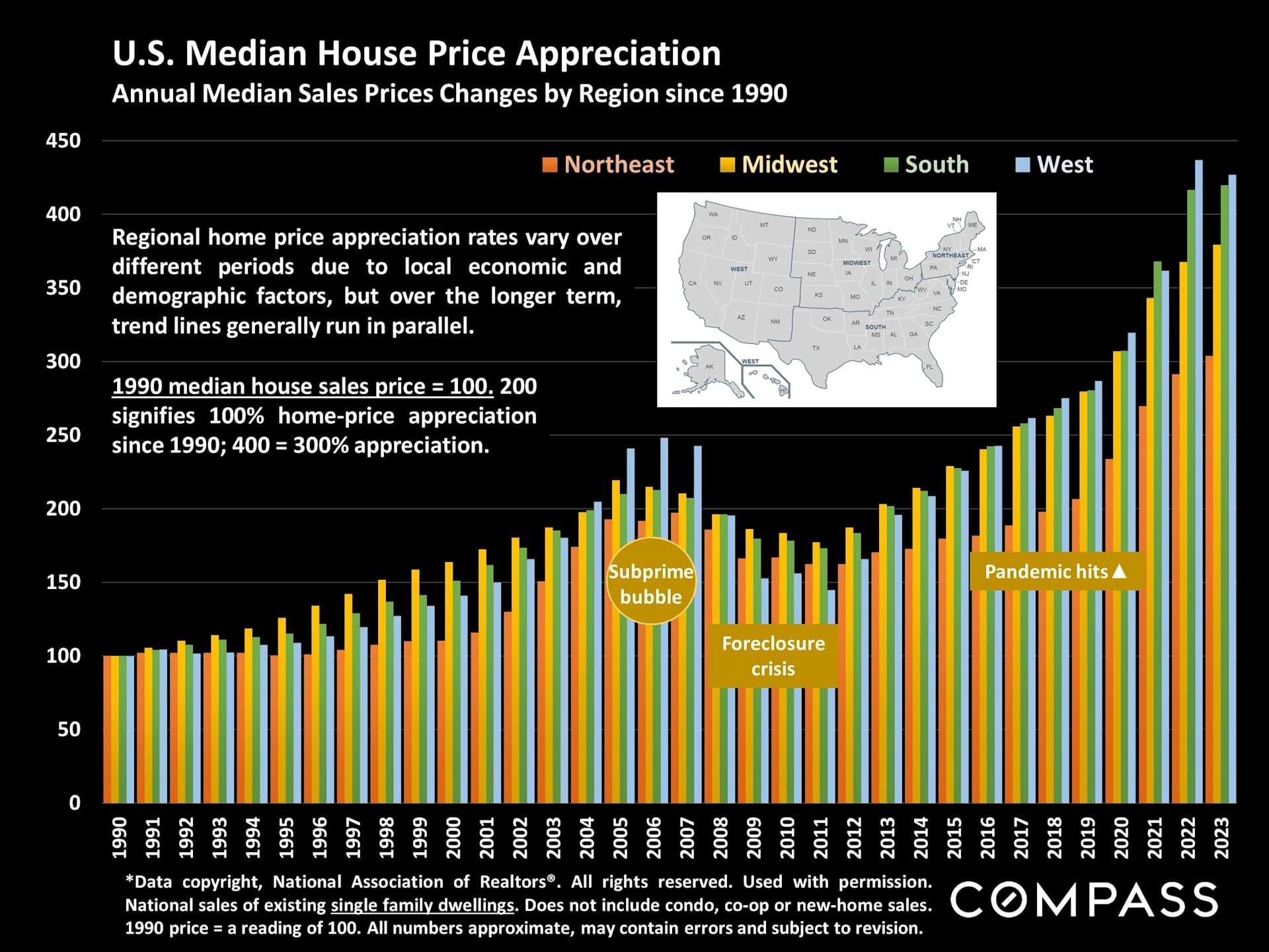 Annual median house prices for the 4 U.S. regions: Prices & appreciation rates vary due to local conditions, but because of national macroeconomic factors, regional trends up and down are usually quite similar over the longer term.