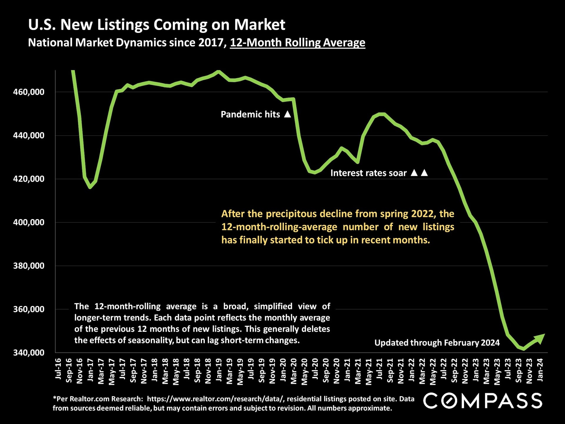 A broad illustration of the 12-month-rolling, average number of new listings coming on market: After falling for 18 months, the trend line is finally turning up again. On a single-month basis, new-listing numbers typically climb rapidly through spring.