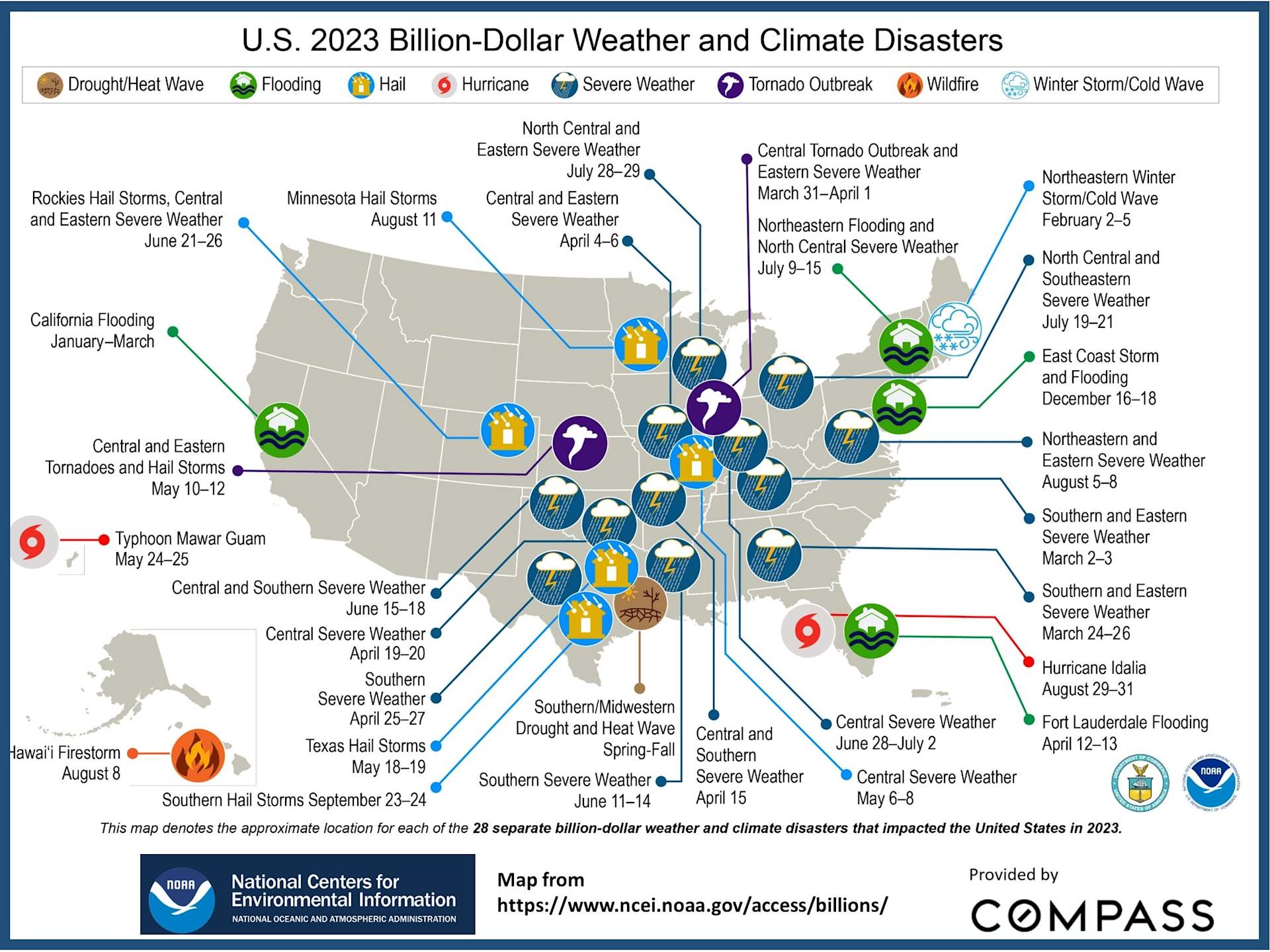 National homeowner's insurance rates have increased 23% in the last 14 months, with some communities seeing much larger hikes - to crisis points. The main factor: In inflation-adjusted dollars, the average, annual cost of "billion-dollar-plus" natural disasters has gone from $21.5 billion in the 1980's to over $144 billion in 2021-2023. Below is the NOAA billion-dollar natural disaster map for 2023.