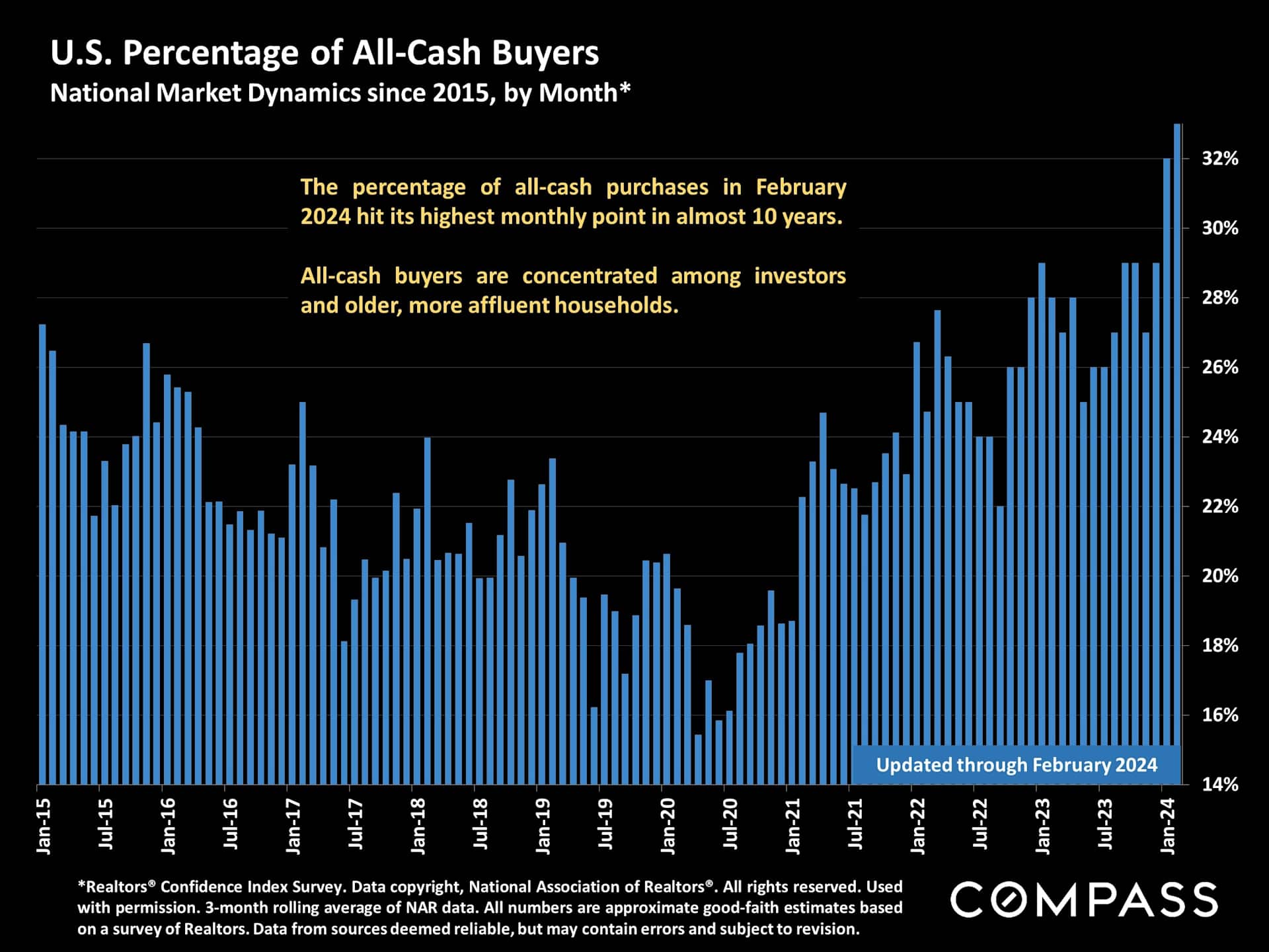 The percentage of homes selling all-cash has continued to rise. First-time homebuyers have faced increasing competition from investors and more affluent homebuyers with the ability to purchase without a loan.