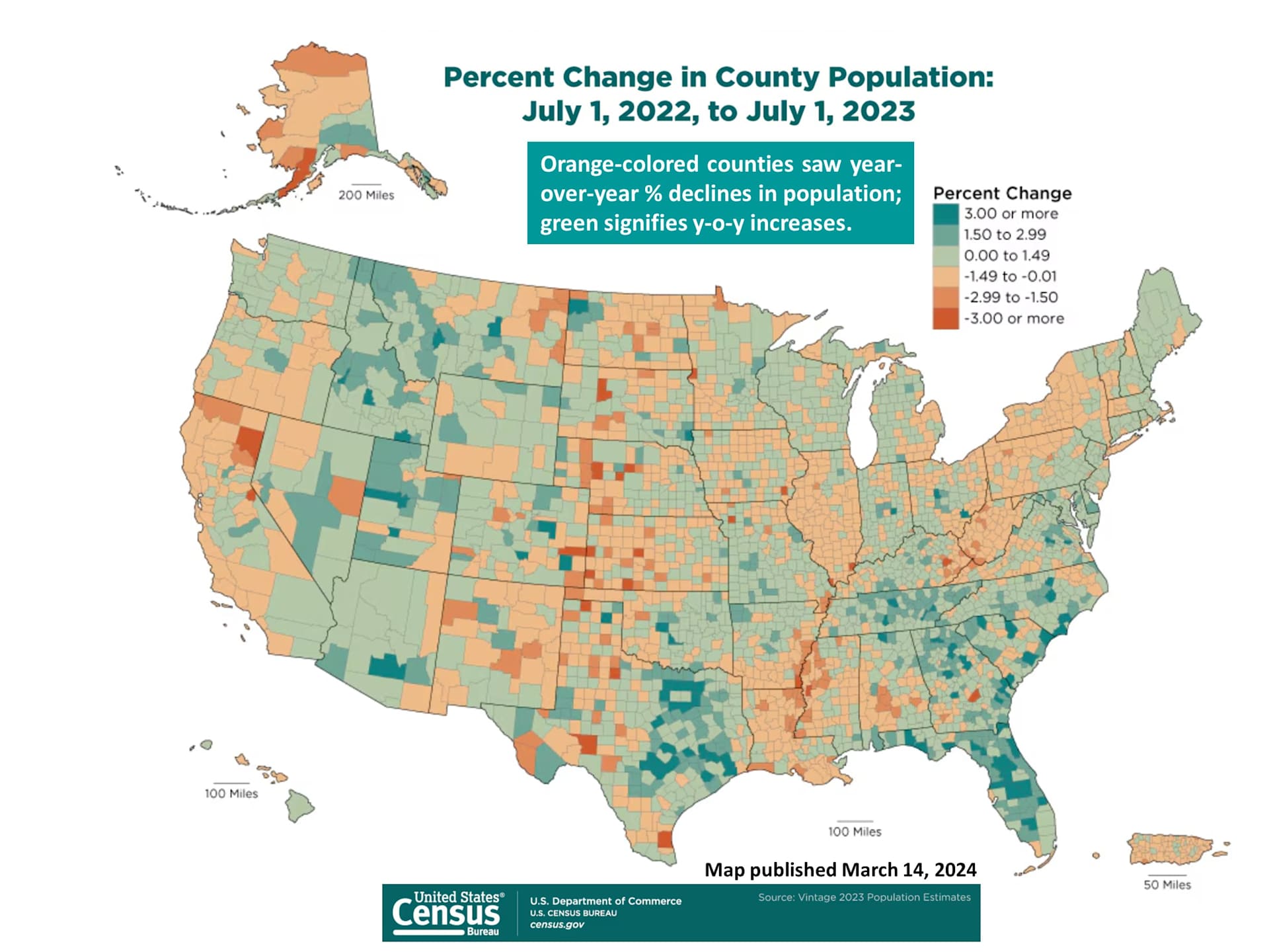 The new U.S. Census map illustrating county population changes 7/1/22 to 7/1/23: The magnitude of changes - mostly due to migration - has declined from 2020-2022, but remains a major factor in many local markets.