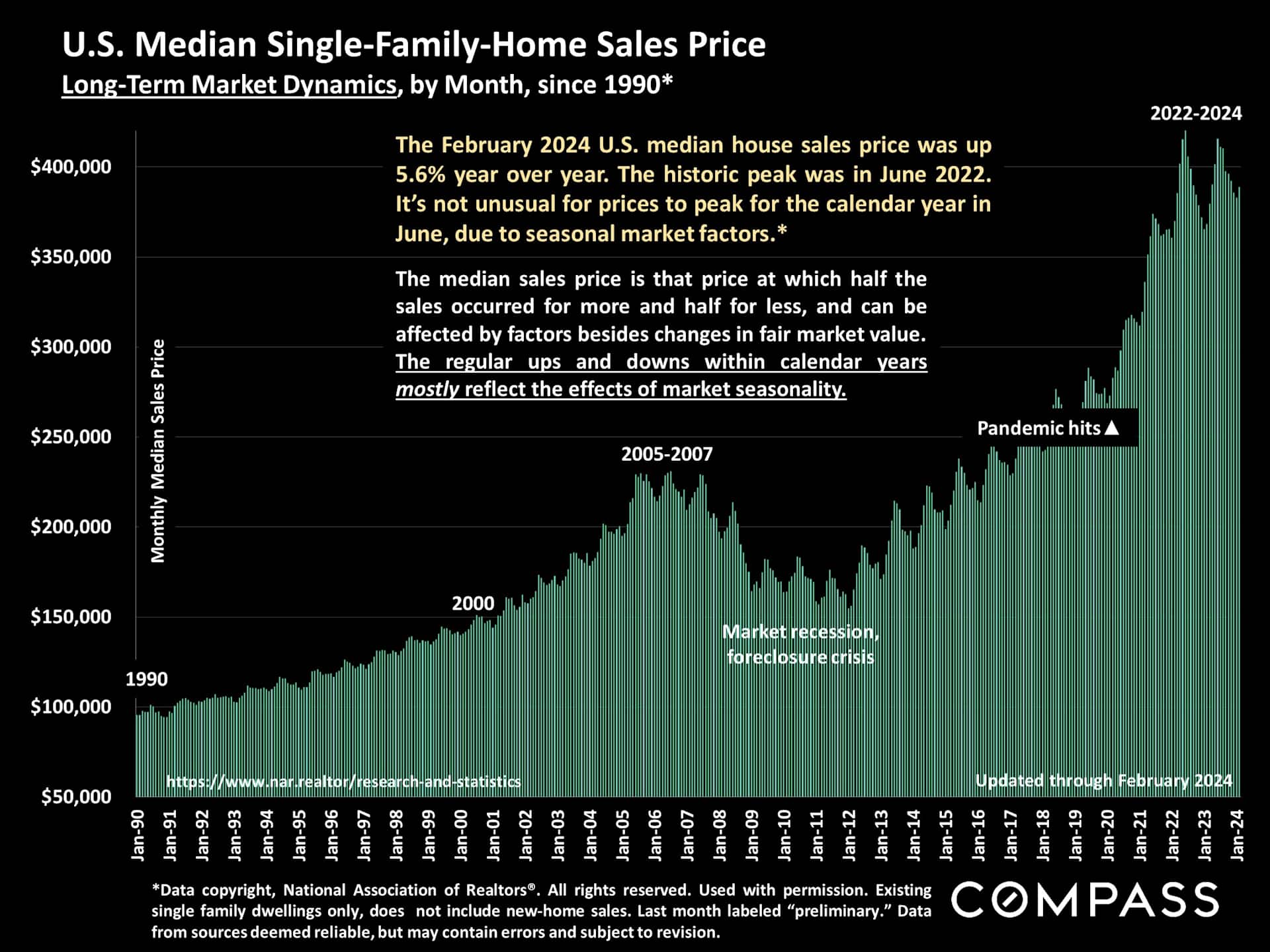 A long-term view of the national median house sales price since 1990. Due to seasonal supply and demand factors, median sales prices usually peak in spring.