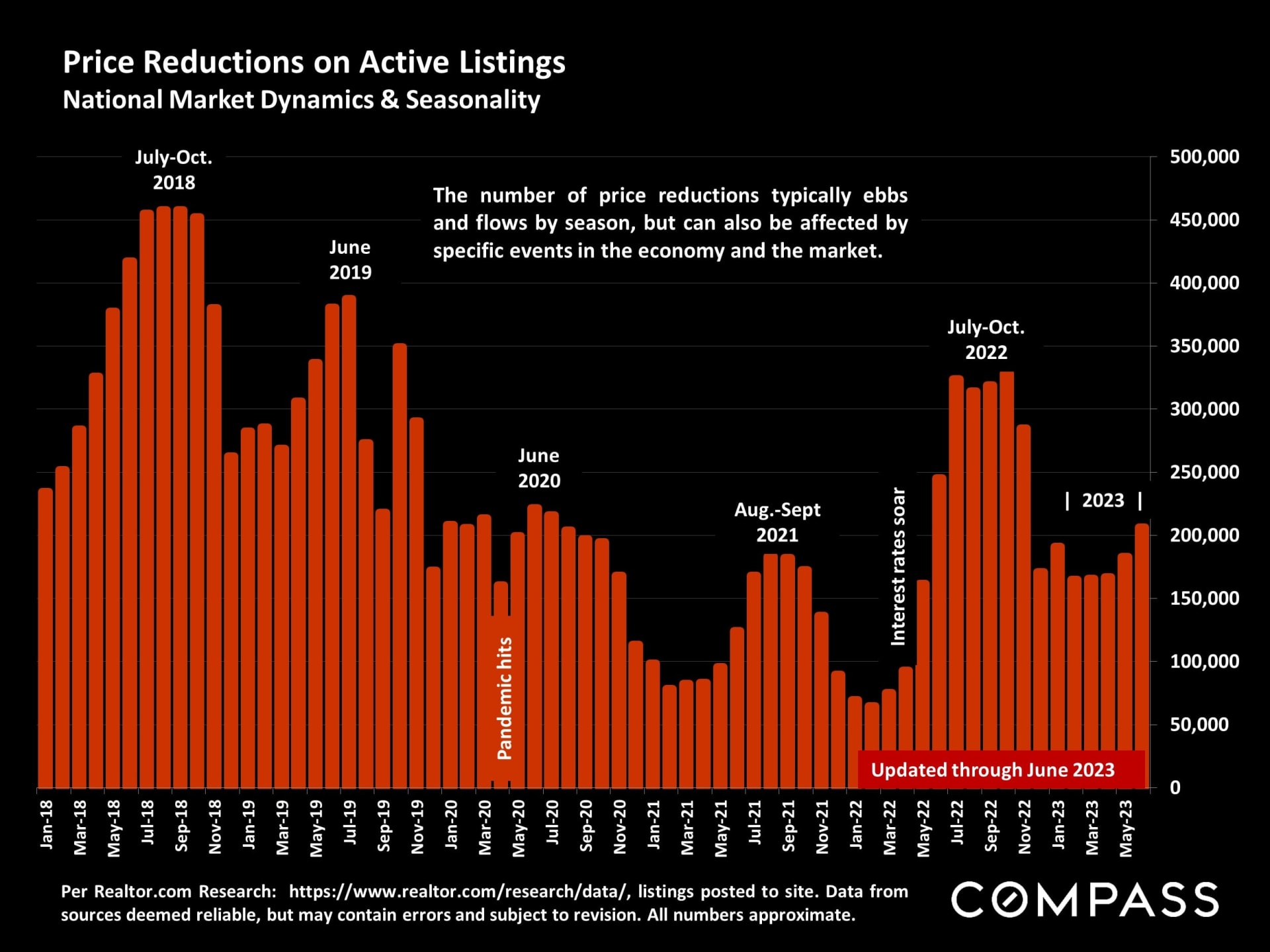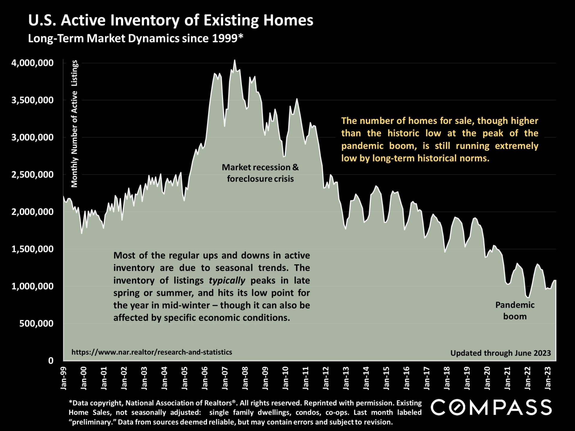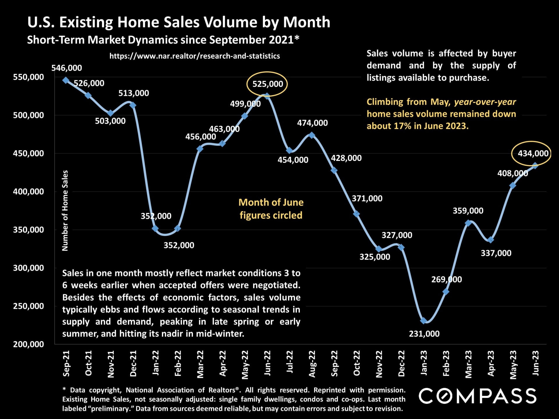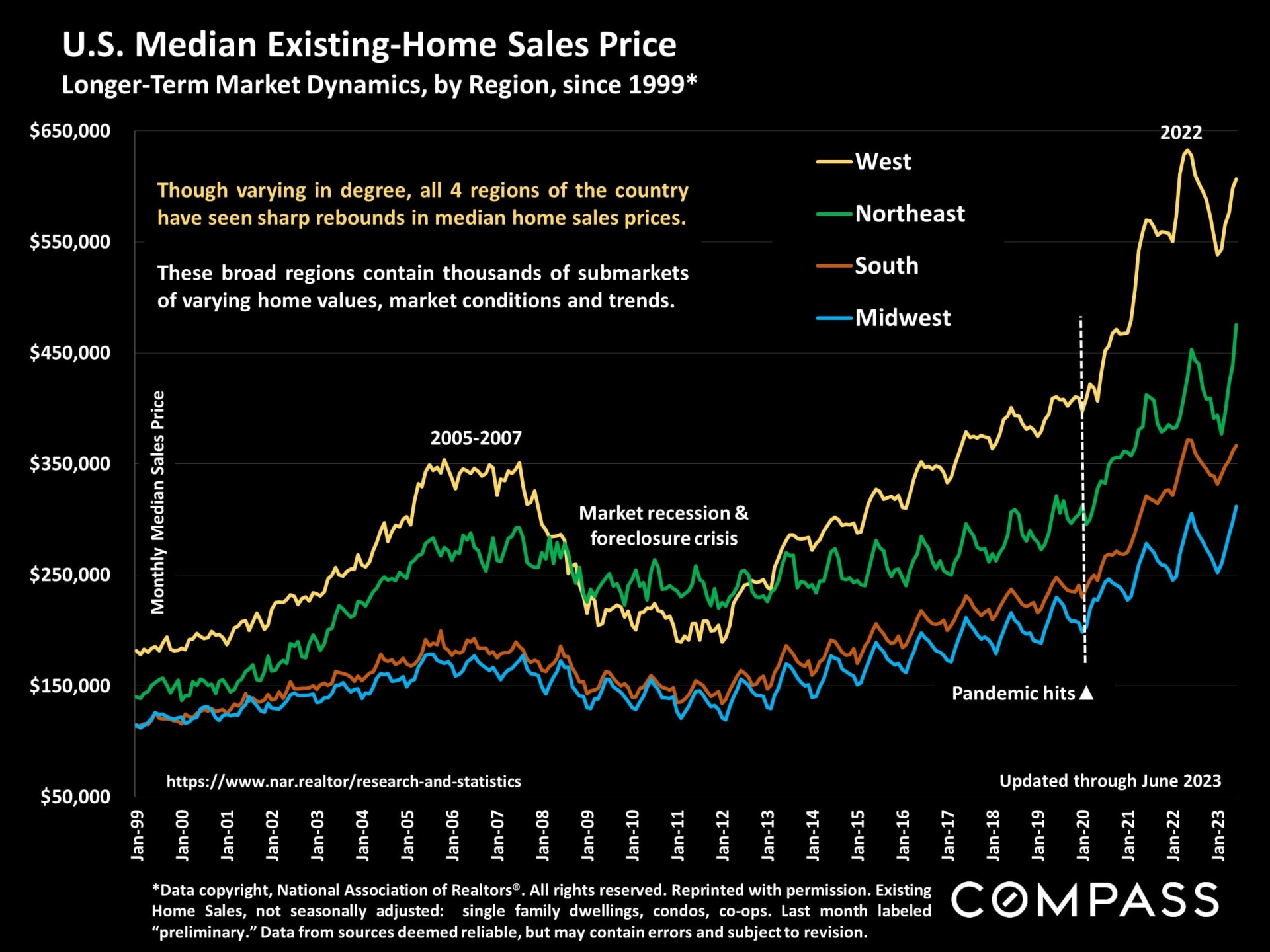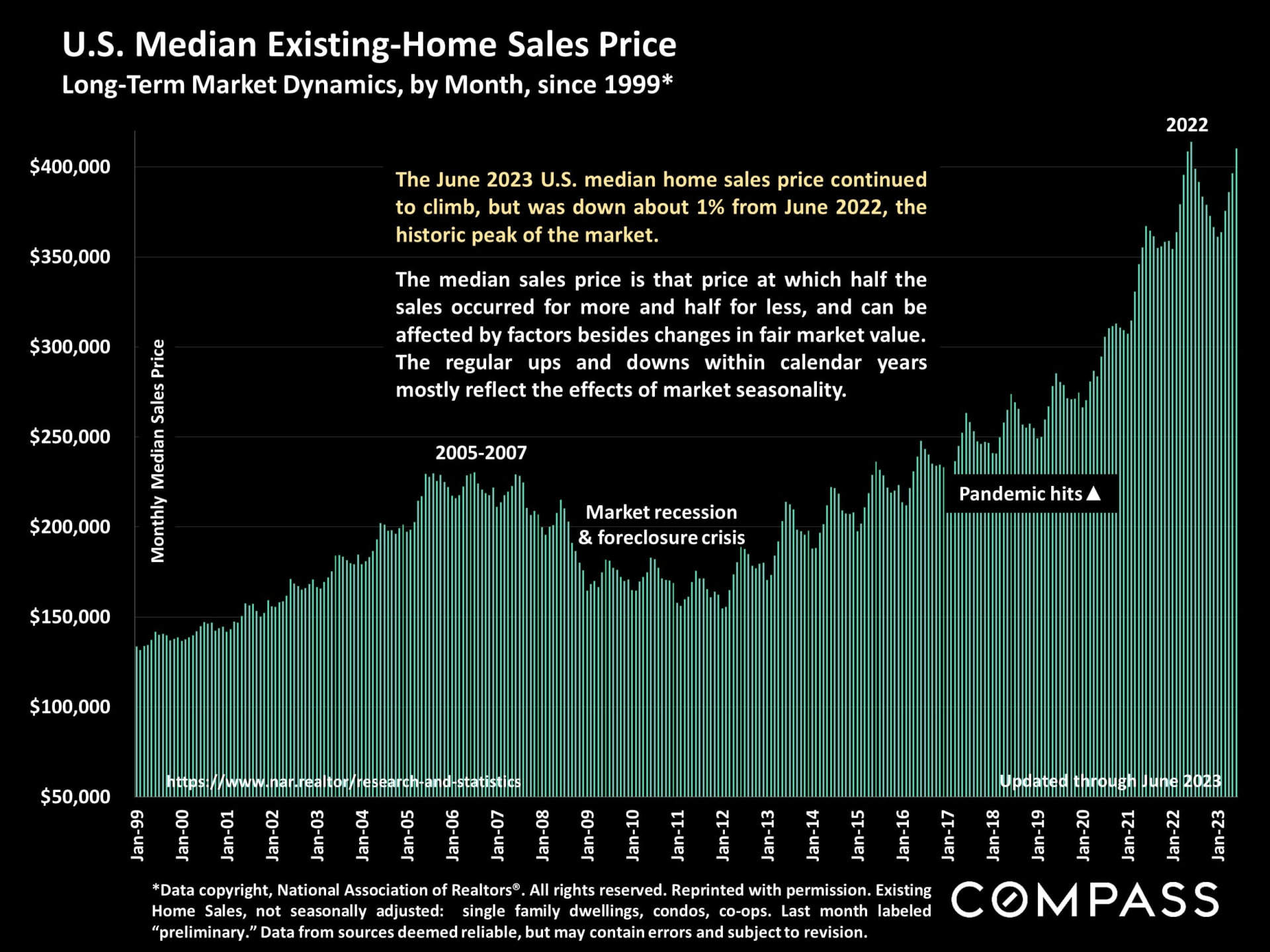 An illustration of long-term, national median home sales prices: The June 2023 price was just 1% lower than in June 2022, the historic peak of the market.