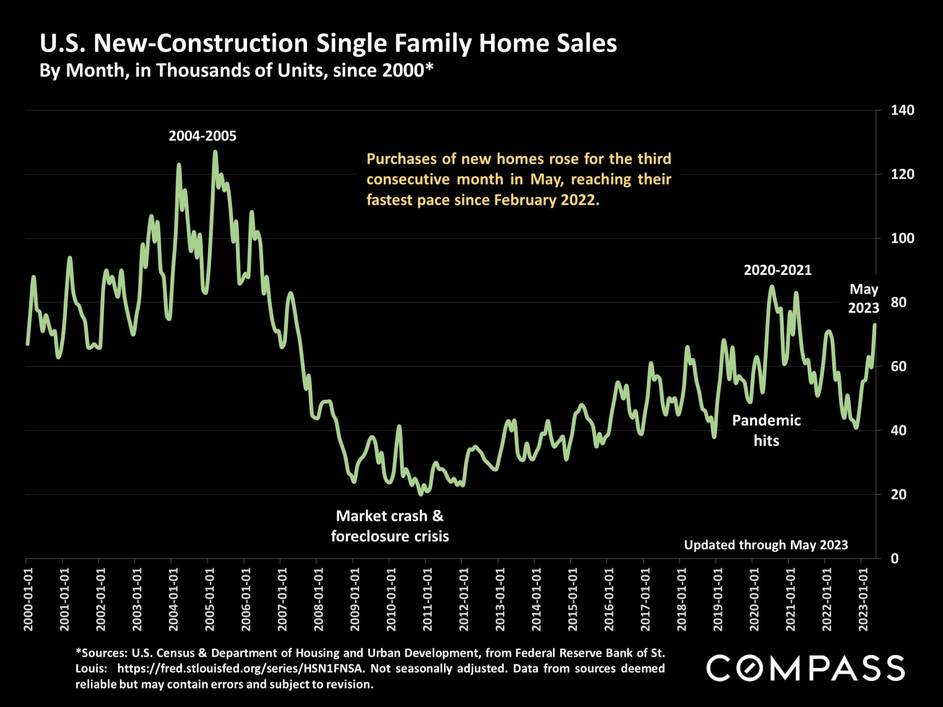 Buyer demand has been on the rise during the spring, but sales have been constrained due to a sharp decrease in new property listings over the past 12 months. This decline is largely attributed to the "mortgage lock-in effect," where homeowners with low-interest rate mortgages are hesitant to sell and relocate. Consequently, this has led to an upward pressure on home prices and a surge in new-home construction, as developers take advantage of the low-inventory conditions.