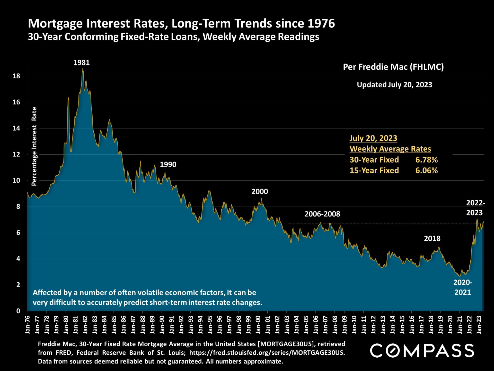 A long-term representation of interest rates shows that in the past year, after experiencing a significant increase in early 2022, 30-year fixed rates have mostly fallen within the range of 6% to 7%.