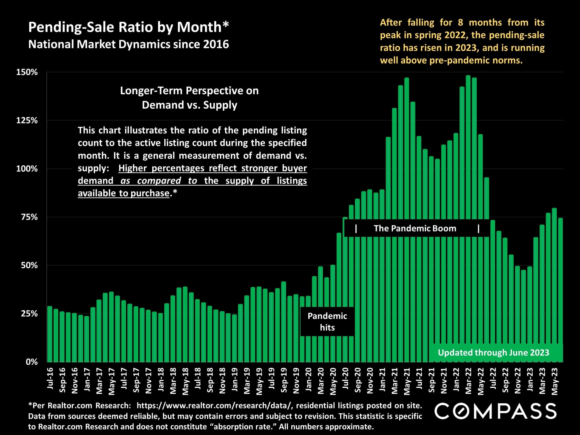 Another perspective on supply and demand is the ratio of pending listings (properties in contract) to active listings. When this ratio is higher, it indicates more competitive market conditions.